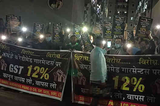 અમદાવાદમાં બુધવારે મોડી સાંજે ગારમેન્ટ અને કાપડ ઉદ્યોગ સાથે સંકળાયેલા વેપારીઓ-કારીગરોએ માર્કેટની બહાર વિવિધ બેનરો સાથે વિરોધ પ્રદર્શન કરીને ૧૨ ટકા જીએસટીનો વિરોધ કર્યો હતો. માર્કેટ-દુકાનની લાઇટો બંધ કરીને મીણબત્તી, મોબાઇલની ટોર્ચ કરીને બેનરો સાથે ઉગ્ર સૂત્રોચ્ચાર કર્યા હતા. આજે તા.૩૦ ડિસેમ્બરના રોજ બંધનું એલાના આપ્યું હતું. જેમાં અમદાવાદમાં તમામ કાપડ માર્કેટ તેનું સમર્થન કરીને દુકાનો માર્કેટ બંધ રાખશે.