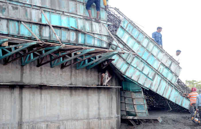 માર્ગ મકાન વિભાગના સૂત્રો અનુસાર સેન્ટરીંગ પછી સિમેન્ટ કોંક્રિટનો માલ અંદર ભરાઈ રહ્યો હતો ત્યારે ત્યાંથી હિટાચી કે અન્ય કોઈ વાહનનો ભાગ અડકી જતા અકસ્માતથી આ ભાગ ધસી પડયો છે. રૂ।. 70 કરોડના ખર્ચે બનતા 1200 મીટર લંબાઈના આ હાઈલેવલ બ્રિજમાં કૂલ 24 પિયર છે અને 16 પિયરનું કામ થયું છે, હજુ સ્લેબનું કામ શરૂ થયું નથી.
