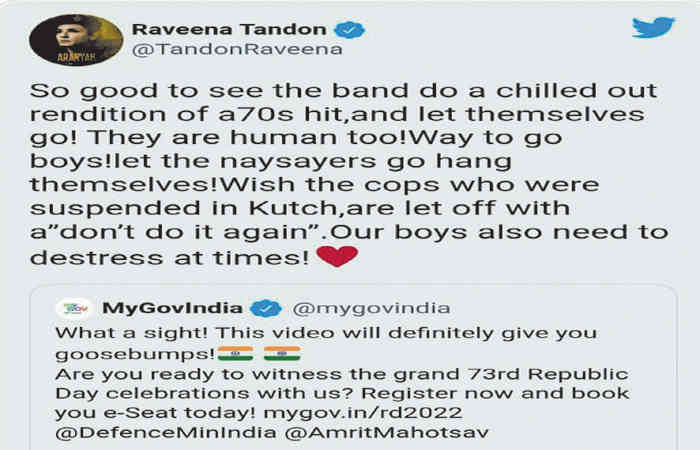 ગણતંત્ર દિવસની ઉજવણીની તૈયારી કરી રહેલા એરફોર્સના જવાનો જુના હિન્દી ગીતના બેન્ડ ઉપર ડાન્સ કરી રહ્યાં છે તેવો વિડિયો સોશિયલ મીડિયા ઉપર વાઈરલ થયો હતો. આ વાઈરલ વીડિયો જોઈને જવાનોની સ્થિતિ સમજીને તેમને હળવા થવાની તક આપવી જોઈએ તેવી વાત કરીને જાણીતી અને પીઢ અભિનેત્રી રવિના ટંડને એરફોર્સ જવાનોની તરફેણ કરી હતી.
