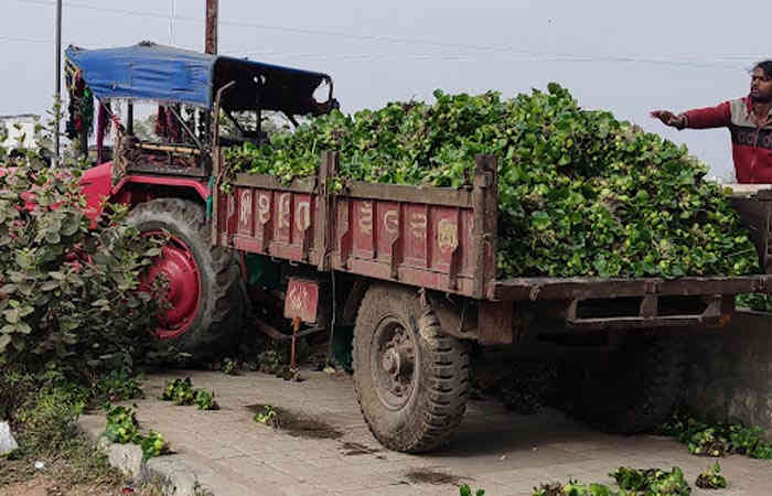 – ટ્રેક્ટરો ભરીને તળાવમાંથી જંગલી વનસ્પતિ બહાર કાઢવામાં આવી રહી છે