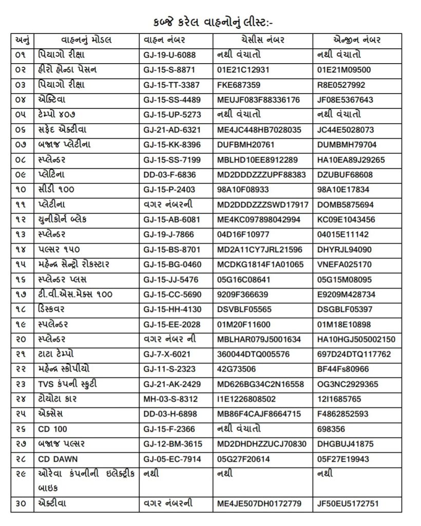 અનુસંધાને કબ્જે કરેલ વાહનોની મુદત વિત્યે જાહેર હરાજી કરવામાં આવશે અને હરાજીમાં