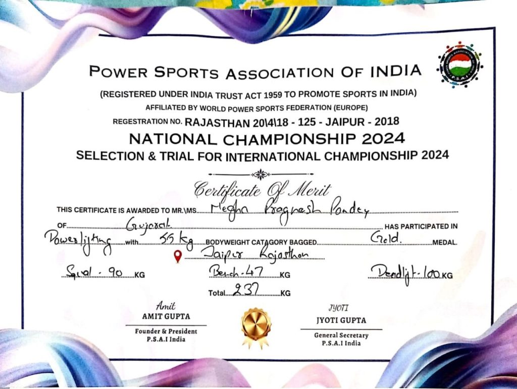 આ સ્પર્ધામાં ભાગ લેવા માટે વલસાડ તાલુકાની પારડી સાંઢપોર શાળાના શિક્ષકા મેઘા પ્રજ્ઞેશ પાંડેની પસંદગી થઈ છે. હવે પછી તેઓ આંતરરાષ્ટ્રીય સ્તરે પાવર લિફ્ટીંગ સ્પર્ધામાં ભાગ લઈ પોતાનું કૌશલ્ય બતાવી દેશનું પ્રતિનિધિત્વ કરશે. આ ઉપરાંત મેઘા પાંડેએ અગાઉ અખિલ ભારતીય મુલકી સ્પર્ધામાં દિલ્હી ખાતે નેશનલ ટુર્નામેન્ટ રમી શાળા તથા જિલ્લાનું નામ રોશન કર્યું છે.