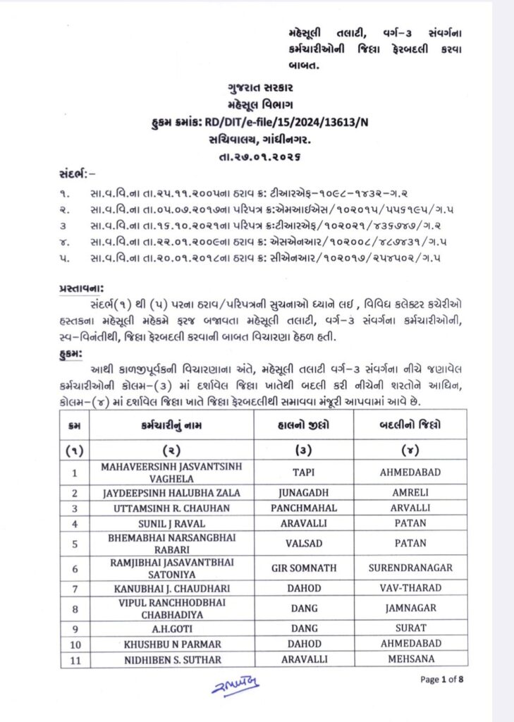Breaking newsNewsગુજરાત ગુજરાત મહેસૂલ વિભાગ દ્વારા 207 જેટલા તલાટીઓ ની એક સામટે બદલી કરાઈ By Khabar dar On: January 27, 2026 9:05 PM Share this article: Whatsapp Channel Join Now Telegram Group Join Now « पिछला વલસાડ જિલ્લા ભાજપ યુવા મોરચા પ્રમુખ તરીકે પ્રભાકર યાદવ ની નિમણૂક अगला વાપીમાં વિકાસના નામે ખોદકામ, ટ્રાફિકની સમસ્યા વિકટ »
