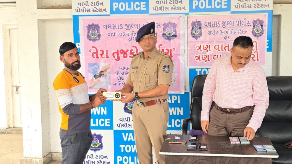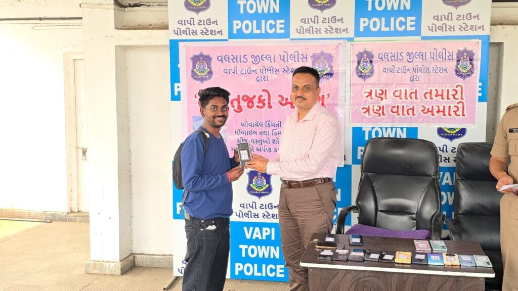 વાપી ટાઉન પોલીસ સ્ટેશને શુક્રવારે ૨૩ ખોવાયેલા મોબાઈલ ફોન તેમના મૂળ માલિકોને પરત સોંપી નાગરિકો પ્રત્યેની પોતાની જવાબદારી નિભાવી છે. આ મોબાઈલ ફોનની કુલ કિંમત રૂ. ૫,૭૧,૬૯૧ જેટલી છે.