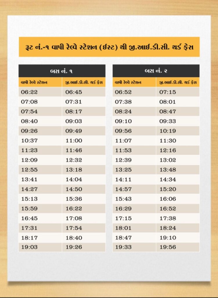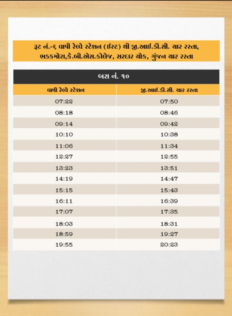 વાપી રેલ્વે સ્ટેશન(ઈસ્ટ) થી જી.આઈ.ડી.સી. ચાર રસ્તા, ભડકમોરા,કે.બી.એસ.કોલેજ, સરદાર ચોક, ગુંજન ચાર રસ્તા