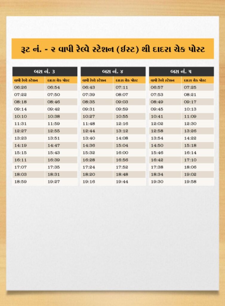 વાપી રેલ્વે સ્ટેશન(ઈસ્ટ), માર્ગ અને મકાન વિભાગ ઓફીસ વાપી, ગોદાલ નગર, જી.આઈ.ડી.સી. ચાર રસ્તા, વી.આઈ.એ ચાર રસ્તા, ભડકમોરા, શેલ્બી હોસ્પિટલ, ચણોદ ગેટ, કે.બી.એસ. કોલેજ, ડુંગરા તળાવ, હરિયા પાર્ક, ડ્રીમ હાઈટ, બુલેટ ટ્રેન સ્ટેશન, સાસા સારવી બિલ્ડીંગ, દાદરા ચેક પોસ્ટ