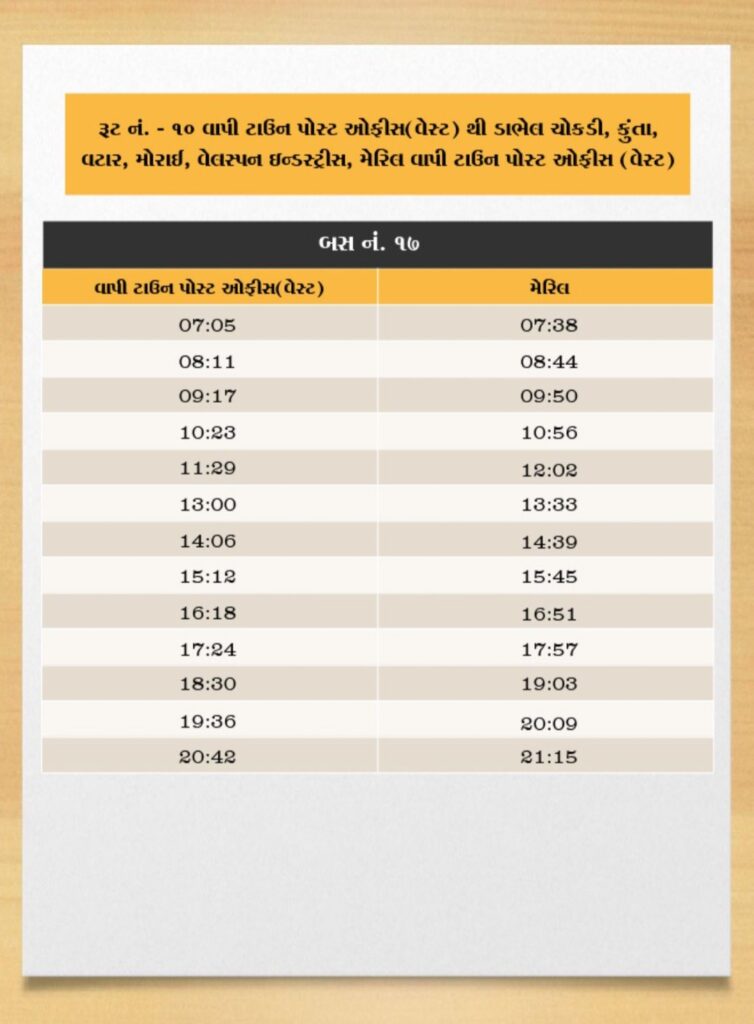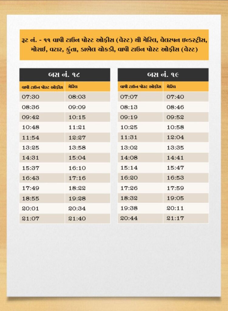 વાપી ટાઉન પોસ્ટ ઓફીસ(વેસ્ટ) થી ડાભેલ ચોકડી, કુંતા, વટાર, મોરાઈ, વેલસ્પન ઇન્ડસ્ટ્રીસ, મેરિલ, વાપી ટાઉન પોસ્ટ ઓફીસ (વેસ્ટ)