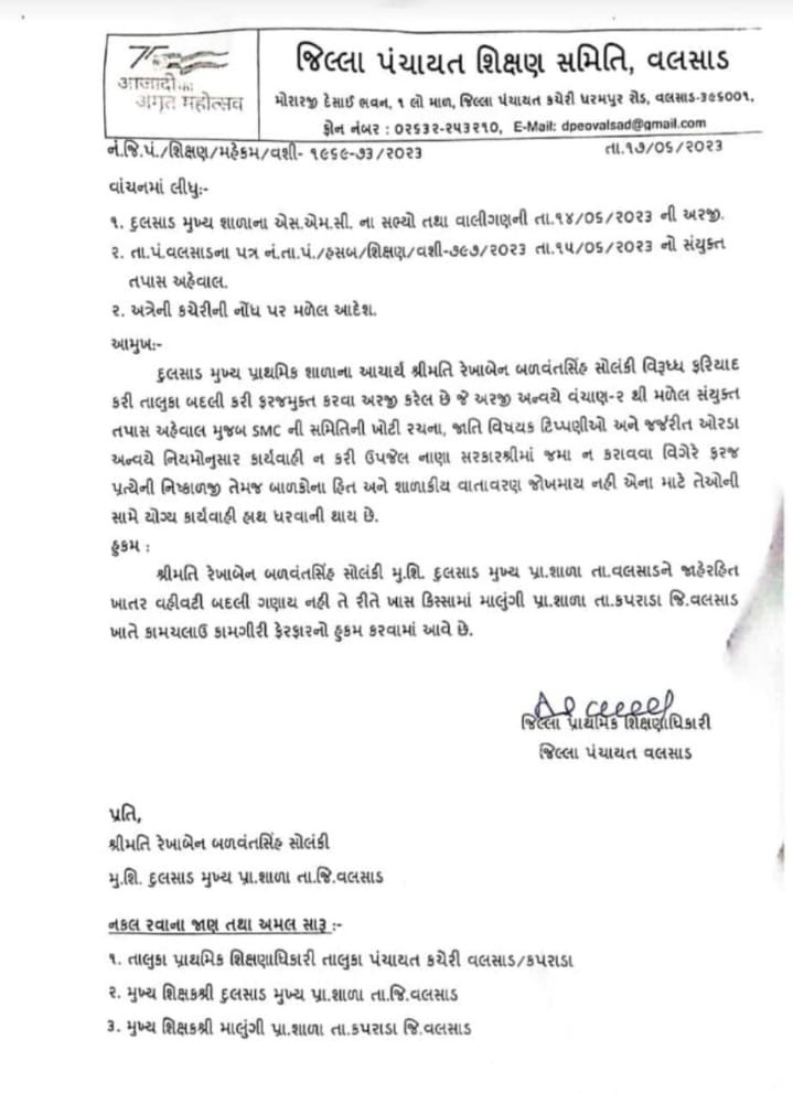 વલસાડ તાલુકાના દુલસાડ ગામે આવેલી પ્રાથમિક શાળામાં આચાર્ય તરીકે ફરજ બજાવતા મહિલા આચાર્ય દ્વારા આદિવાસી વિદ્યાર્થીઓ માટે જાતિગઢ ટિપ્પણી કરી વિવાદ છેડતા વાલીઓમાં રોષની લાગણી જોવા મળી હતી અને વાલીઓએ સ્કૂલ ઉપર જઈને હું બાળો બતાવ્યો હતો સમગ્ર બાબતે વાલીઓ અને એસએમસી સભ્યો દ્વારા શિક્ષણ અધિકારીને મહિલાને ફરજ મોકૂફ કરવા માટે લેખિતમાં રજૂઆત કરી હતી જે અંગે તપાસ કમિટી સ્થળ પર પહોંચી રિપોર્ટ કર્યા બાદ મહિલા આચાર્યની બદલી કરવામાં આવી છે
