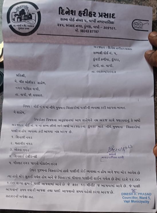 વાપી પાલિકા ના વોર્ડ નંબર 5 ડુંગરા ડુંગરી ફળીયા કોર્પોરેટર દિનેશ હરિહર પ્રસાદ દ્વારા પાલિકા ચીફ ઓફિસર ને ગત તારીખ 9 5 2023 ના રોજ લેખિત માં રજુઆત કરી જણાવ્યું હતું કે ડુંગરા ડુંગરી ફળીયા માં આવતા શિવાજી નગર ,મહાવીર નગર,એકતા નગર,શિવ સાઈ રેસિડેન્સી તેમજ મિલલત નગર માં પારલે ગોડાઉન તરફ છેલ્લા કેટલાક સમય થી પાણી ની લાઈન નથી અને જે વિસ્તારમાં લાઈન છે ત્યાં રાત્રે 12 વાગ્યે 1 વાગ્યે પાણી આપવામાં આવે છે અને એ પણ માત્ર 10 મિનિટ સ્થાનિક લોકોએ પીવાનું પાણી લેવા જવું ક્યાં ?પાણી આપવાનો સમય વધારી આપવામાં આવે અને વહેલા સમયે પાણી આપવામાં આવે એવી માંગ કરી છે છતાં આજ દિન સુધી પાણી મળી રહ્યું નથી