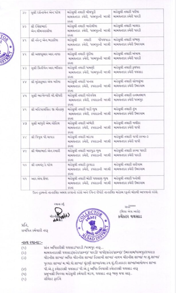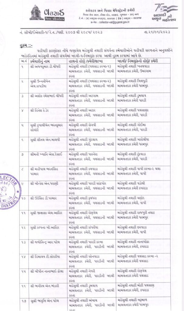 Newsગુજરાત વલસાડ જિલ્લાના 51 મહેસુલી તલાટીની બદલીના ઓર્ડર By Khabar dar On: June 27, 2023 2:01 PM Share this article: Whatsapp Channel Join Now Telegram Group Join Now Page 01 Page 02 Page 03 બદલીના ઓર્ડર ને લઈ કહી ખુશી કહી ગામનો માહોલ જોવા મળી રહ્યો છે « पिछला આદિવાસી દીકરી સાથે બનેલી ઘટના માં દોષિતો સામે કાયદાકીય કાર્યવાહી કરવાની માંગ સાથે વલસાડ જિલ્લા ટ્રાઇબલ પાર્ટીના પ્રમુખે પ્રાંત મારફતે ગૃહ મંત્રીને અને મુખ્ય મંત્રીને આવેદન પાઠવ્યું अगला ખેરગામ તાલુકા 108ની ટીમે માનવતા મહેકાવી.અકસ્માતમાં ઇજાગ્રસ્ત યુવક પાસે મળેલા 12000 રોકડ પરિવારને પરત કર્યા »