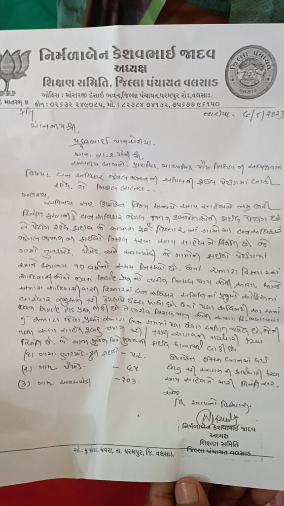 અનેક સ્થળે રજુઆતો કરી ને થાકેલા જીલ્લા પંચાયતના શિક્ષણ સમિતિના ચેરમેન નિર્મળાબેન જાદવે આદિવાસી દિવસના કાર્યક્રમમાં હાજર રહેલા રાજ્ય કક્ષાના મંત્રી પ્રફુલ પાનસેરિયાને લખિતમાં રજૂઆત કરી