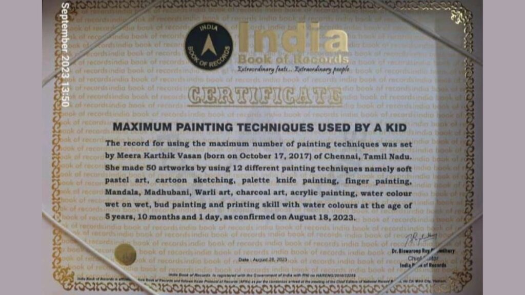 પાંચ વર્ષની વિદ્યાર્થીનીએ 12 ટેકનિકોનો ઉપયોગ કરીને 50 આર્ટવર્ક બનાવીને મહત્તમ સંખ્યામાં પેઇન્ટિંગ ટેકનિકનો રેકોર્ડ બનાવ્યો