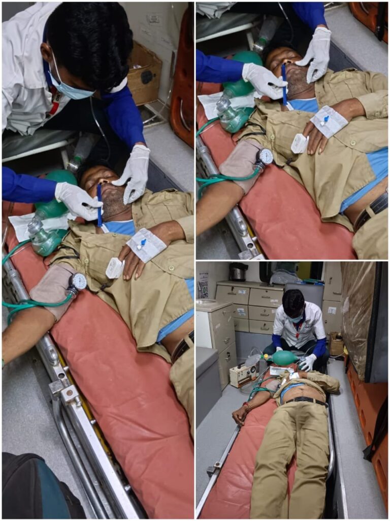 ત્યાર બાદ ઘટના સ્થળ પર પહોંચી ને જોવા ઈ એમ ટી પ્રવિણ વણોલ દ્વાર જોવા મળ્યું કે એક ભાઈ (બસ કંડકટર ) જેમની આશરે ઉંમર 48 વર્ષ છે પેસેન્જર બસ ની પેસેન્જર સીટ અર્ધ બે ભાન અવસ્થા માં પડી રહેલ છે અને તેમને શ્વાસ લેવામાં તકલીફ પડે છે પેસાબ (urine)પણ કરી દીધેલ અને તેને ઉબકા પણ આવતા આ બધું જોઇ ને 108 એમ્બ્યુલન્સ માં ફરજ બજાવતા EMT પ્રવિણ વણોલ અને પાઇલોટ વિજય ગાવીત જરૂરીવાઇટલ ચેક કરી ને જરુરી સારવાર આપિ ને બસ નાં ડ્રાઈવર અને બાજુ માં ઉભિ રહેલી પબ્લિક નાં મદદ થી 108 એમ્બ્યુલન્સ માં ખસેડવા માં આવ્યાં     ત્યાર આ દર્દી ને ઓક્સિજન નુ પ્રમાણ બિલકુલ ઓછું હતું અને શ્વાસ લેવા માં ખુબજ તકલીફ પડતી હતી અને અર્ધ બે ભાન અવસ્થા માં હોવાથી આ દર્દી પૂરતા પ્રમાણમાં શ્વાસ પણ લહી સક્તું ન હતુ અને આ દર્દી ને બ્લડ પ્રેશર પણ વધારે આવતું હતું જેથી આ દર્દી ને air way cliyar કરી ને Air Way Menten કરેલ અને કુત્રીમ રિતે (BVM) દ્વાર શ્વાસ આપતા અને અમદાવાદ ફિજીસિયન નાં માર્ગ દર્શન હેઠળ જરુરી દવા અને સારવાર આપી ને નજીકની હોસ્પિટલ કપરાડા સામૂહિક આરોગ્ય કેન્દ્ર ખાતે લઈ ગયેલ અને Dr દ્વારા કહેવામાં આવ્યું કે આ દર્દી ને સસ્પેકટેડ હાર્ટ અટેક (હદય નો હુમલો) હૉય સકે જેથી આ દર્દી ને
