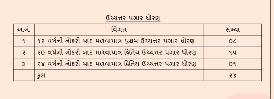 વાપી તેમજ કચેરી ની શીટ શાખા દ્વારા કાર્યવાહી હાથ ઘરવામાં આવેલ હતી. આ બઢતી કાર્યવાહી અન્વયે આજરોજ તા.૦૮/૧૧/૨૦૨૩ ના રોજ વલસાડ જીલ્લામાં ફરજ બજાવતા હથિયારી/બિન હથિયારી પોલીસ કોન્સ્ટેબલ તથા હેડ કોન્સ્ટેબલને બઢતી આપવામાં આવેલ તથા પાત્રતા ધરાવતા પોલીસ કર્મચારીઓને મળવાપાત્ર ઉચ્ચતર પગાર ધોરણ મંજુર કરવામાં આવેલ છે. આમ પોલીસ કર્મચારીઓને સમયસર બઢતી અને ઉચ્ચત્તર પગાર ધોરણના લાભ મળવાના કારણે પોલીસ કર્મચારીઓની કાર્યક્ષમતામાં વધારો થશે અને વધુ ખંત અને નિષ્ઠાપુર્વક કામગીરી કરવા પ્રેરીત થશે. નીચે કોષ્ટકમાં જણાવેલ જુદા જુદા સંવર્ગના પોલીસ કર્મચારીઓને બઢતી તથા ઉચ્ચતર પગાર ધોરણ આપવામાં આવેલ છે.