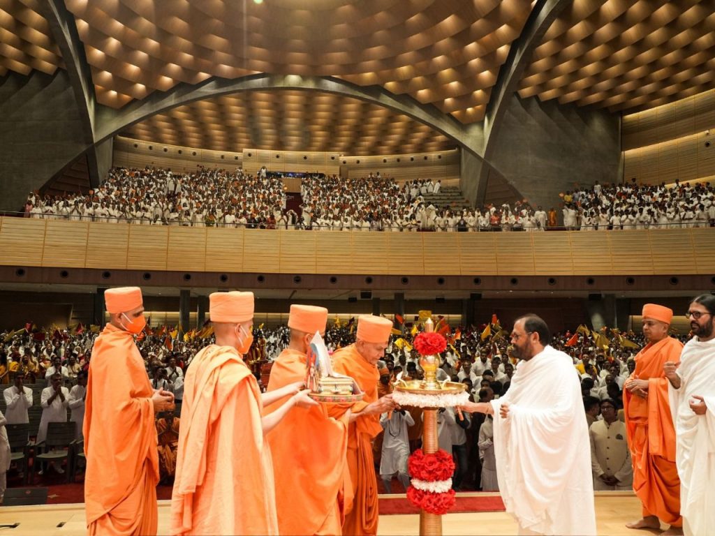 આ પ્રસંગ માત્ર એક ધાર્મિક સંવાદિતાનું ઉદાહરણ જ નહીં પણ બે સંસ્થા અને વર્તમાન સમયના બે પ્રબુદ્ધ સંતો વચ્ચેના પ્રેમભર્યા ગાઢ સંબંધોને ઉજાગર કરી રહ્યો હતો. શ્રીમદ્ રાજચંદ્ર મિશન ધરમપુરનું પ્રેમભર્યું આમંત્રણ સ્વીકારીને ૯૧ વર્ષની ઉંમરે પણ ખાસ સમય કાઢીને પૂજ્યશ્રી મહંત સ્વામી મહારાજ આ લોકાર્પણ પ્રસંગે પધાર્યા એ ઐતિહાસિક ક્ષણો બની રહી હતી. પૂજ્યશ્રી મહંત સ્વામી મહારાજ રાજ સભાગૃહના લોકાર્પણ કરવા શ્રીમદ્ રાજચંદ્ર આશ્રમ, ધરમપુરમાં પૂ. શ્રી બ્રહ્મવિહારી સ્વામી અને અન્ય સંતો સાથે પધાર્યા હતા. તેઓશ્રીએ અહીં સ્થાપિત શ્રીમદ્દ રાજચંદ્રજીની 34 ફૂટ ઊંચી પ્રતિમાજીના દર્શન અને પ્રક્ષાલ પૂજા કરી હતી તથા જિનમંદિરમાં તેઓ દર્શન પૂજા અર્થે પધાર્યા હતા. રાજ સભાગૃહના લોકાર્પણ પ્રસંગે હજારો ભક્તોની પ્રત્યક્ષ અને વિશ્વભરમાં ઓનલાઈન નિહાળતાં લાખો ભક્તોની ઉપસ્થિતિમાં પૂજ્ય ગુરુદેવશ્રી રાકેશજી અને પૂજ્યશ્રી મહંત સ્વામી મહારાજે ‘રાજ સભાગૃહ’ની તક્તીનું અનાવરણ કરી, આ જાજરમાન સંકુલનું ઉદ્ઘાટન કર્યું હતું.