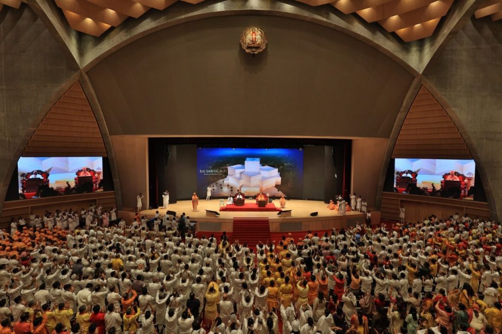 આ પ્રંસગે પૂજ્યશ્રી મહંત સ્વામી મહારાજે સ્નેહાદર સાથે આશિષ આપતાં કહ્યું કે, “જોવાલાયક તો અહીં ઘણું છે, પણ આજે અમે પૂજ્ય ગુરૂદેવશ્રી રાકેશજી મહારાજના પ્રેમની દોરથી ખેંચાઈને આવ્યા છીએ. શ્રીમદ્દ રાજચંદ્રજી ખુબ મહાન પુરુષ હતા. તેમનું કાર્ય પૂજ્ય ગુરૂદેવશ્રી રાકેશજીએ ખુબ સુંદર રીતે આગળ વધાર્યું છે. અહીં જે સત્સંગ કરશે, સાધના કરશે, તે જીવનમાં ખુબ સુખ શાંતિ પામો, આ સંસ્થાની ખુબ પ્રગતિ થાય અને બધા સેવકો ખુબ સુખી થાય.” પૂજ્ય ગુરૂદેવશ્રી રાકેશજીએ પૂજ્યશ્રી મહંત સ્વામી મહારાજની પ્રશસ્તિ કરતાં કહ્યું કે “તેઓશ્રીને જોઈને લાગે છે કે આપણે સતયુગમાં જીવીએ છીએ. તેઓશ્રીમાંથી પવિત્ર સ્પંદનો વહે છે, જો આપણે તેને ગ્રહણ કરીએ તો જરૂર આંતરિક રૂપાંતરણ અનુભવી શકીએ.” ‘રાજ સભાગૃહ’નો આરસ મઢ્યો ફાનસનો આકાર ચિત્તાકર્ષક છે. જ્ઞાનના તેજસ્વી પ્રકાશના આ પ્રતીકાત્મક અત્યાધુનિક સંકુલની બાહ્ય સુવિધાઓ આંતરિક ઐશ્વર્યને પામવાનું આમંત્રણ આપે છે. રાજ સભાગૃહ આશરે ૧૦ એકરના વિસ્તારનું ૨૦,૦૦૦ લોકોની ક્ષમતા ધરાવતું એક વિશાળ સંકુલ છે. અહીંનું ભવ્ય ઓડિટોરિયમ ગહન આધ્યાત્મિક રહસ્યોને સમજવાનું શક્તિશાળી સ્થાન બની રહેશે.